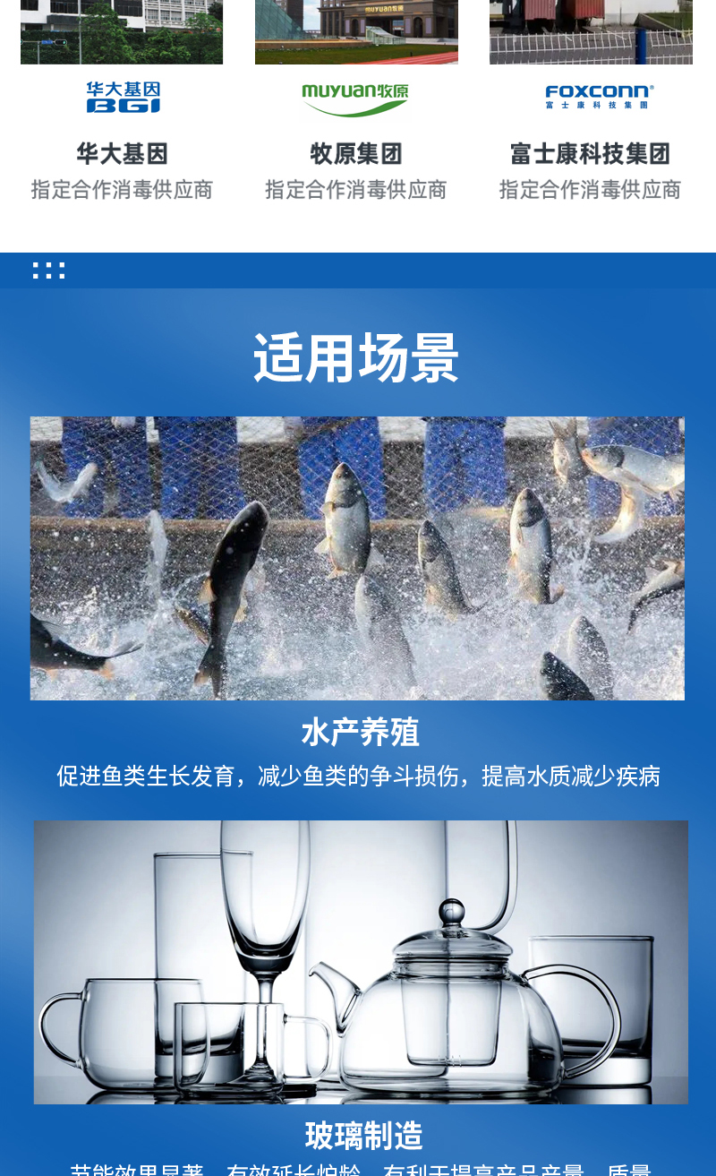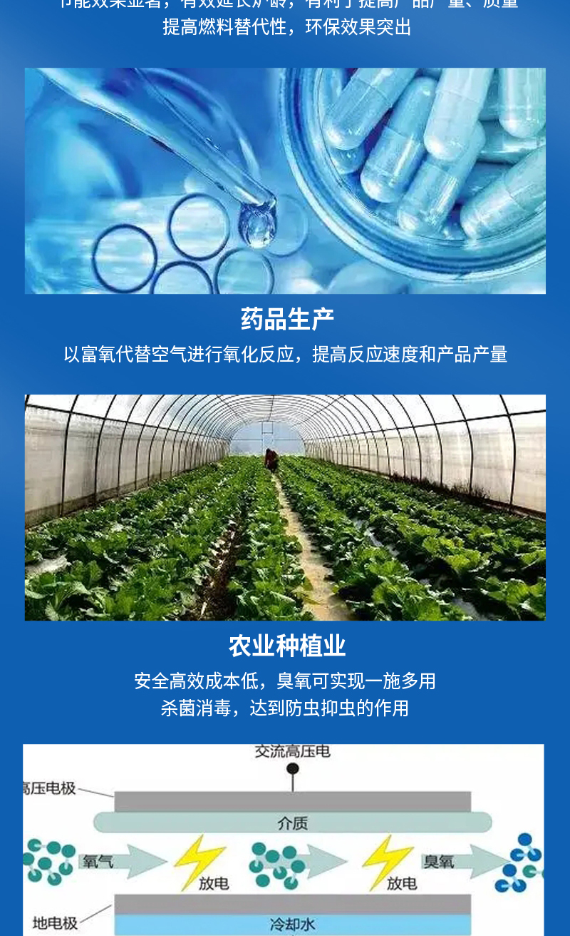 產(chǎn)品廣泛應(yīng)用于工業(yè)、農(nóng)業(yè)水產(chǎn)養(yǎng)殖,藥品生產(chǎn),水處理,玻璃制造和臭氧制取等