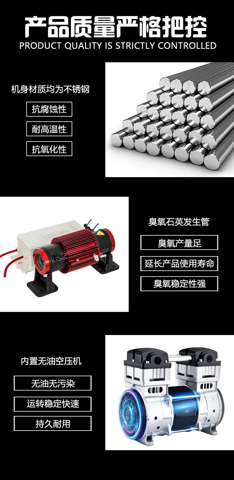 ◆本機(jī)內(nèi)置氧氣發(fā)生單元,臭氧發(fā)生單元,無(wú)油空壓機(jī),過(guò)濾裝置,設(shè)備通電即可使用