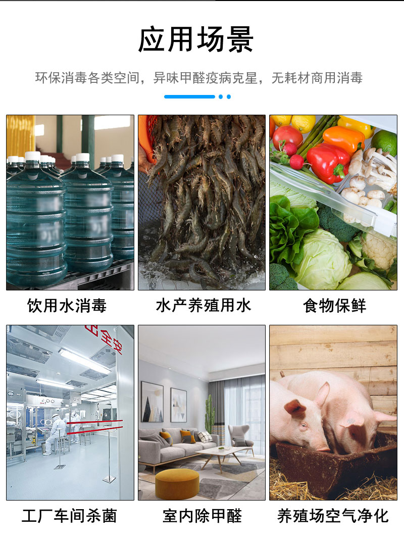 產(chǎn)品適用于對(duì)室內(nèi)環(huán)境空氣、水處理殺菌和特定作業(yè)空間的消毒凈化。如魚塘、泳池、辦公室場(chǎng)所、醫(yī)院、學(xué)校、會(huì)議室、檔案室、娛樂(lè)場(chǎng)所賓館等:食品、飲料、醫(yī)藥等行業(yè)的生產(chǎn)車間、冷庫(kù)、更衣室和其他無(wú)HVAC潔凈區(qū)的空間消毒滅菌。